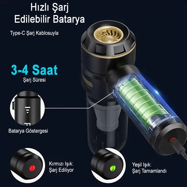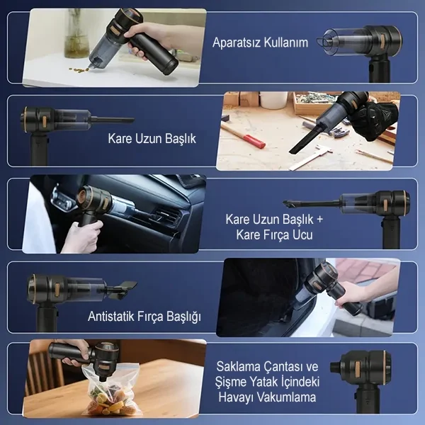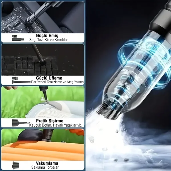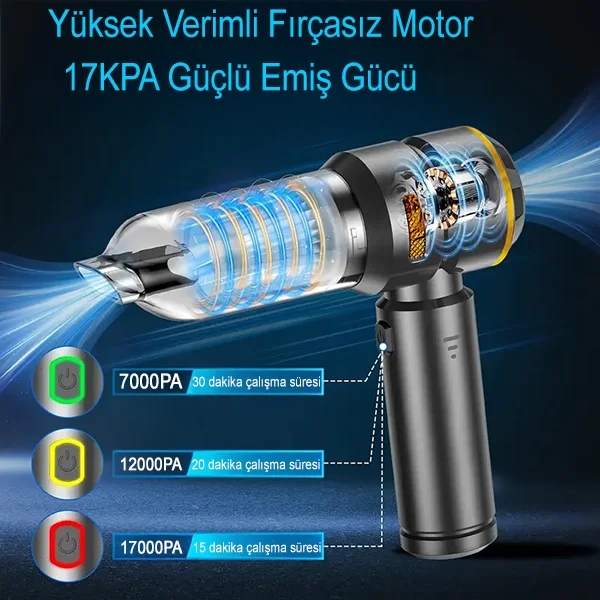 Aracınızda, evinizde veya ofisinizde pratik ve güçlü temizlik arıyorsanız, bu şarjlı mini süpürge tam size göre! 17.000 PA'lık yüksek emiş gücü, kompakt tasarımı ve 3 kademeli güç ayarı sayesinde en inatçı kirleri bile zahmetsizce temizler. Kablosuz kullanımıyla özgürce hareket etmenizi sağlar, taşınabilir yapısı sayesinde her an yanınızda olabilir.
