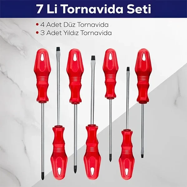 7 Parça Yüksek Kaliteli Tornavida Seti, dayanıklı çelik uçları, ergonomik sap yapısı ve farklı uç tipleriyle hem profesyonellerin hem de ev kullanıcılarının tüm ihtiyaçlarına cevap verir. Uzun ömürlü, sağlam ve güvenli bir kullanım sunar