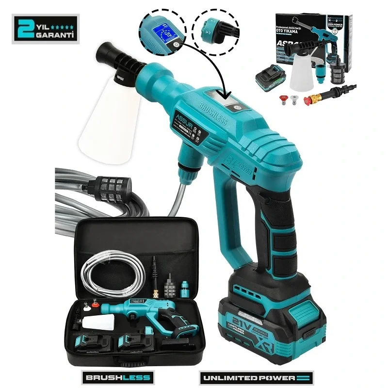Assur 21v Kömürsüz Motor Yüksek Basınçlı Çift Akülü Oto Araba Yıkama Makinesi Şarjlı