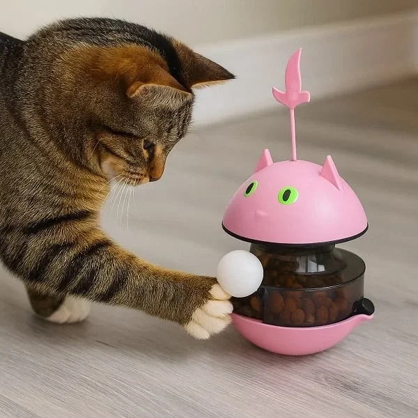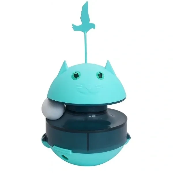 Hacıyatmaz sistemi sayesinde oyuncak devrilmez, her darbede tekrar ayağa kalkar ve mama çıkışı sağlayarak kedinizin ilgisini sürekli canlı tutar.