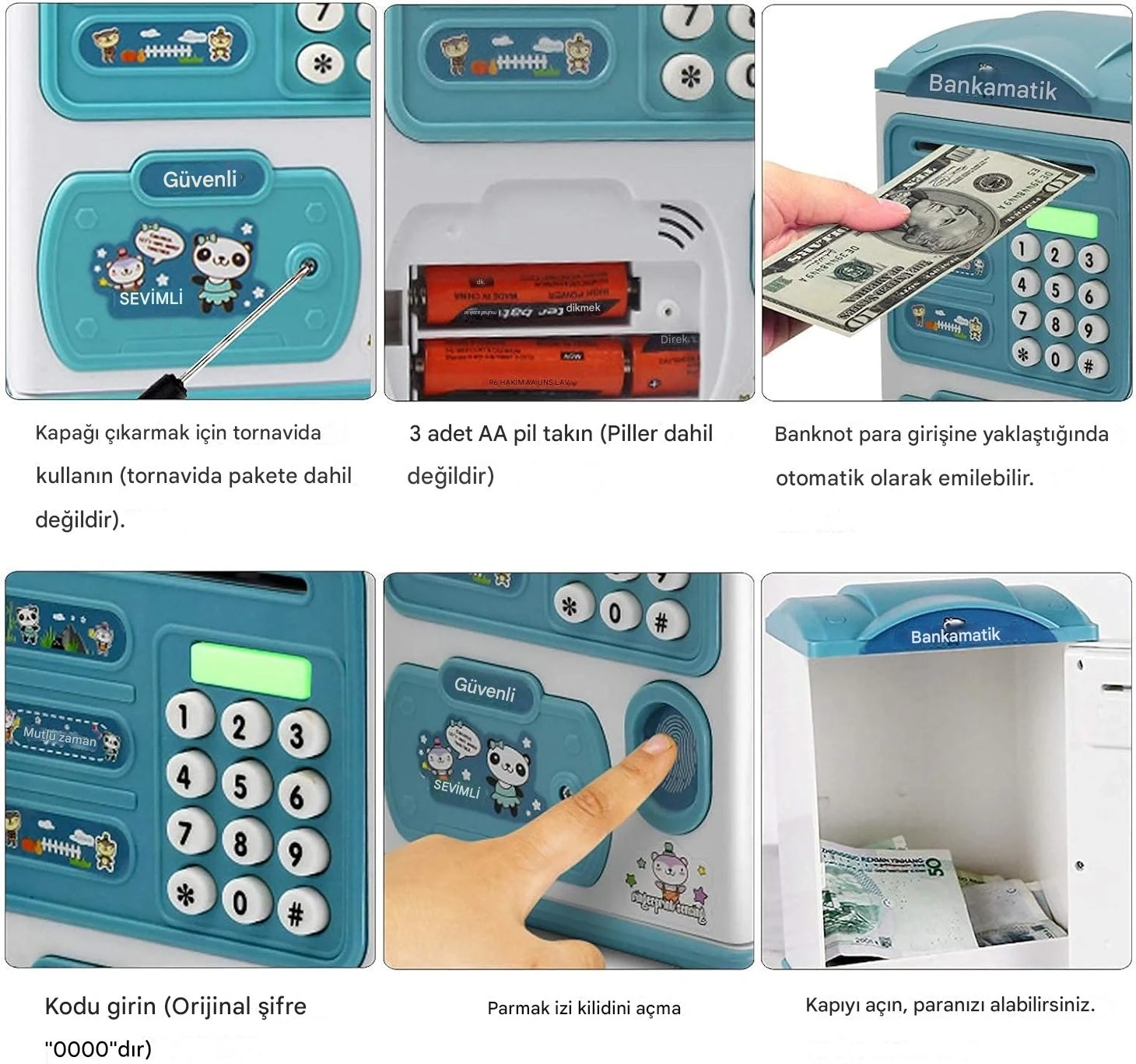 Parmak İzi Görünümlü Elektronik Şifreli Otomatik Kağıt Para Alan ATM Kumbara Mavi