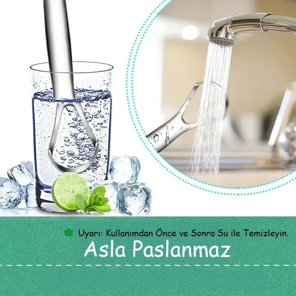 Ağız kokusunu önlemenin ve daha sağlıklı bir nefese sahip olmanın etkili yolu: Paslanmaz çelik dil sıyırıcı! Dil üzerinde biriken bakteri, plak ve toksinleri temizleyerek ağız hijyeninizi üst seviyeye taşır. Ergonomik ve uzun ömürlü yapısıyla günlük ağız bakım rutininizin en etkili yardımcısı olmaya aday