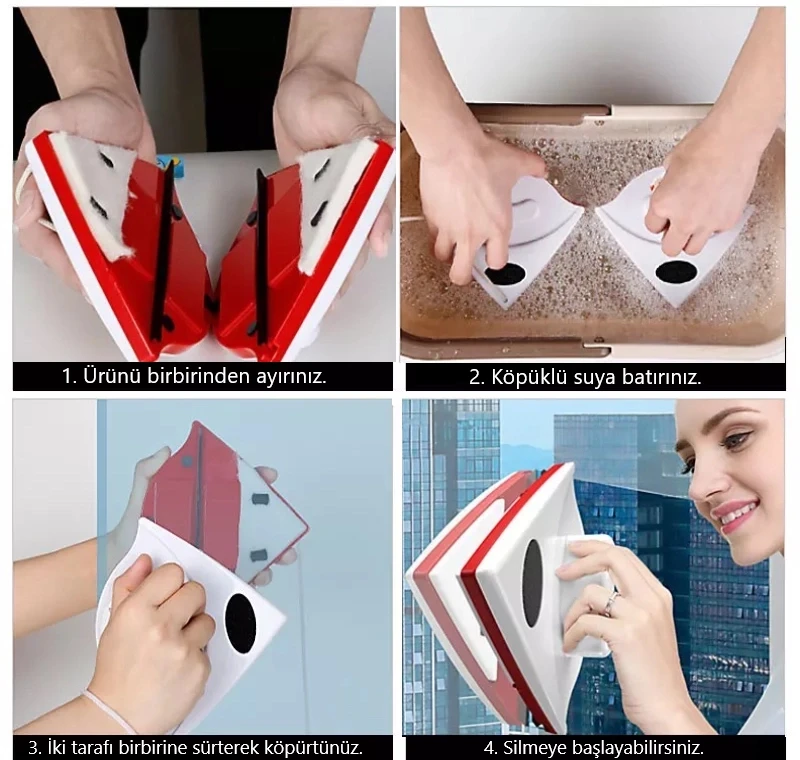 Ürünü kullanmaya başlarken iki parçadan oluşan pratik cam temizleyicinin bir parçasını camın iç yüzeyine, diğerini dış yüzeyine karşı karşıya gelecek şekilde yapıştırıyoruz, tüm yapmanız gereken bu. Ürünün camın dış bölümüne takılan parçası ile iç bölümüne takılan parçalarını birbirine bağlayan ip sayesinde, ürün camdan kurtulsa bile aşağı düşmez.